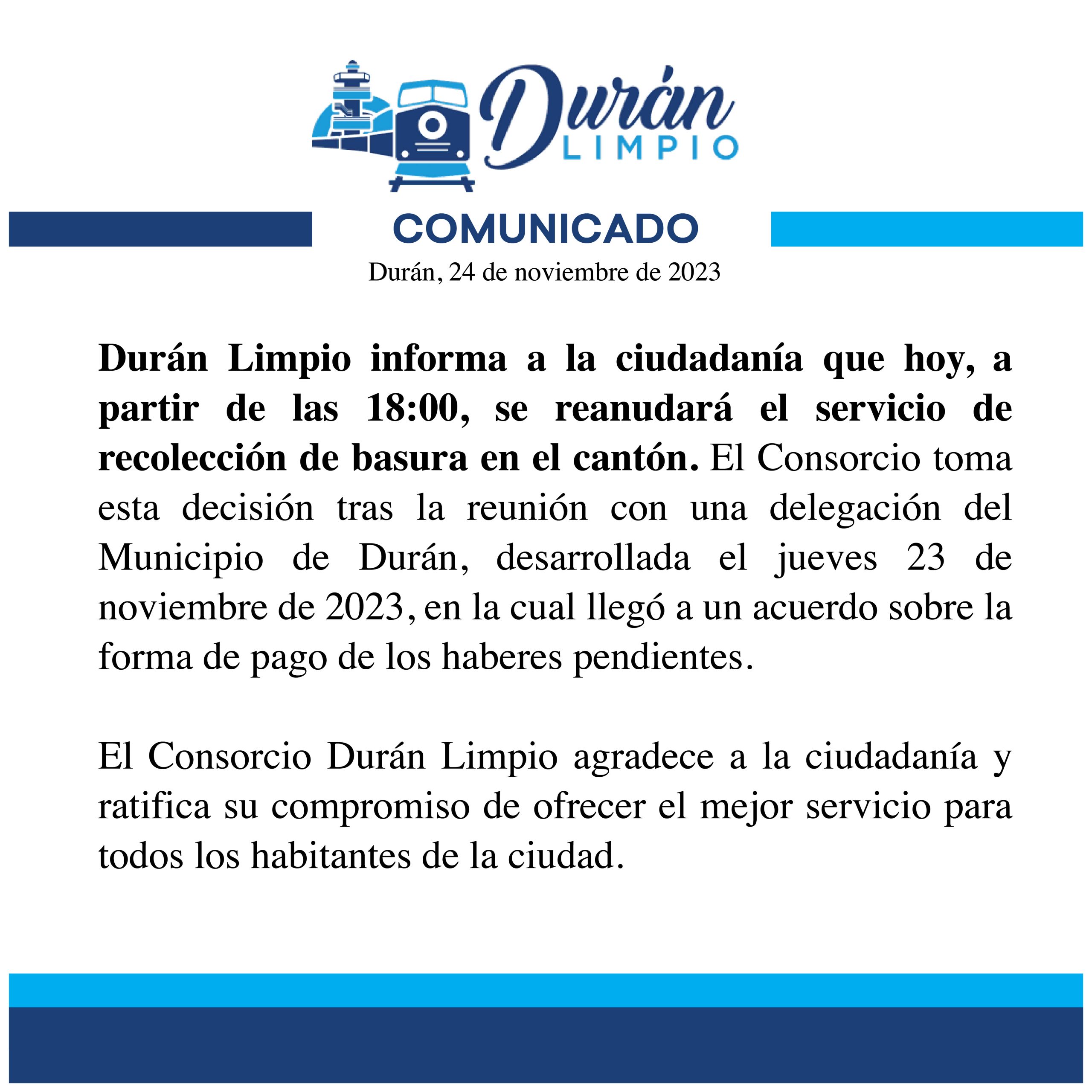 • Durán Limpio informa a la ciudadanía que hoy, a partir de las 18:00, se reanudará el servicio de recolección de basura en el cantón.