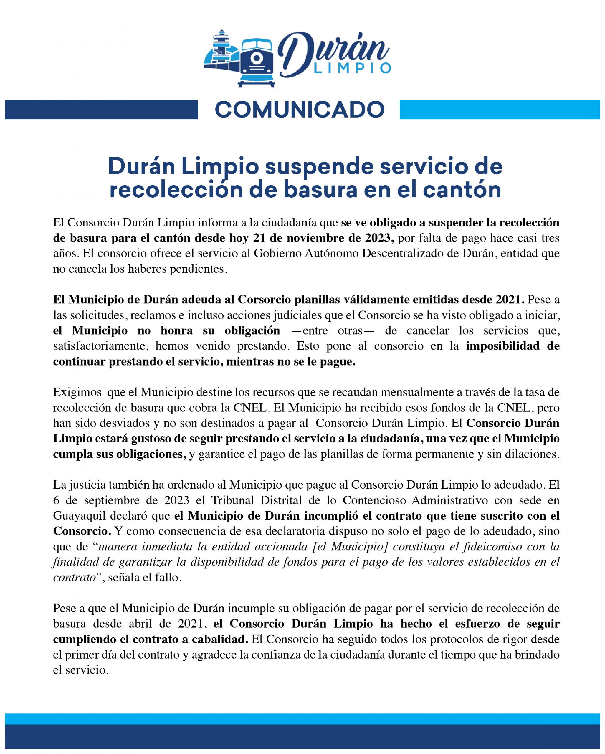 El Consorcio Durán Limpio informa a la ciudadanía que se ve obligado a suspender la recolección de basura para el cantón desde hoy 21 de noviembre de 2023, por falta de pago hace casi tres años. El consorcio ofrece el servicio al Gobierno Autónomo Descentralizado de Durán, entidad que no cancela los haberes pendientes.