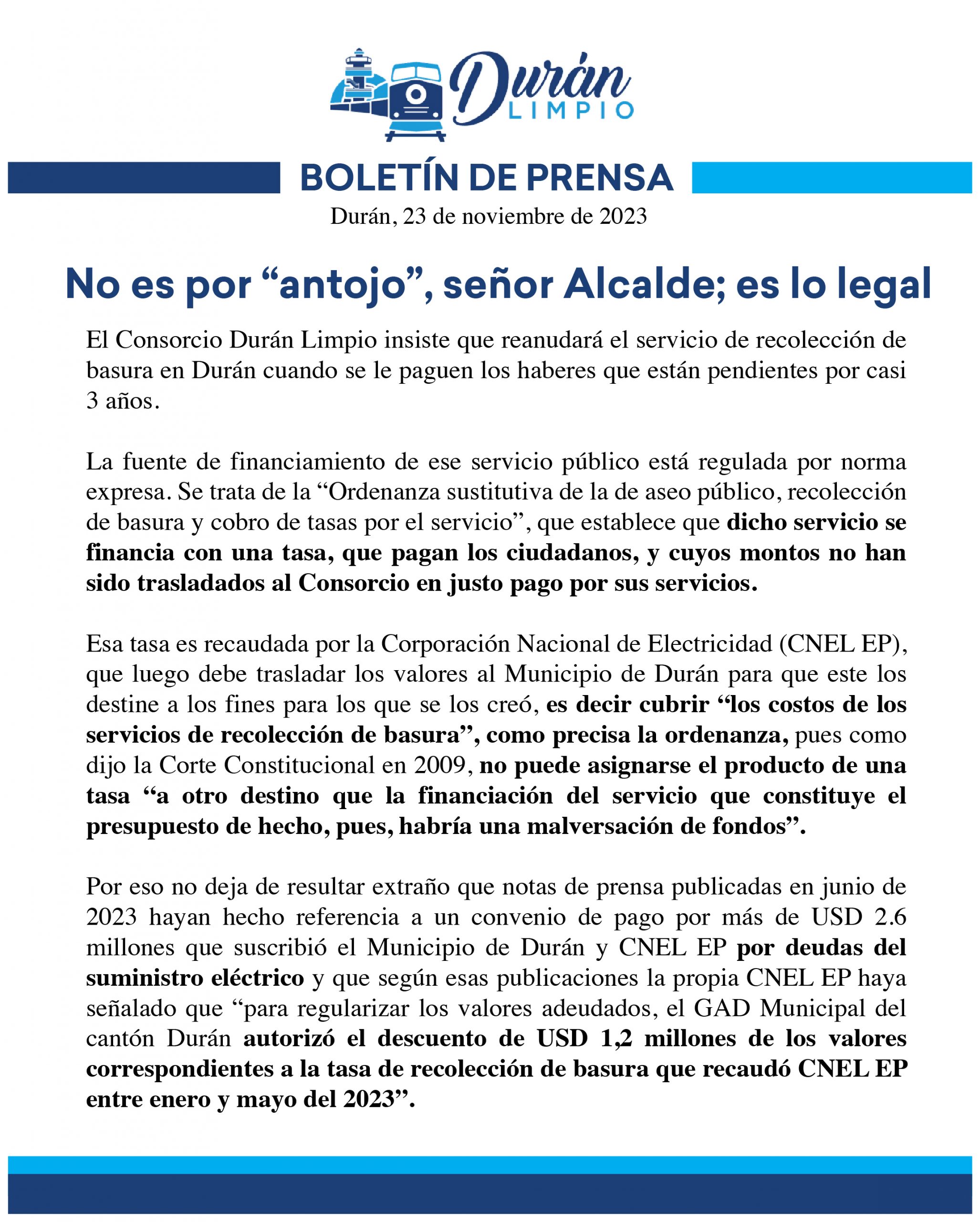 El Consorcio Durán Limpio insiste que reanudará el servicio de recolección de basura en Durán cuando se le paguen los haberes que están pendientes por casi 3 años.